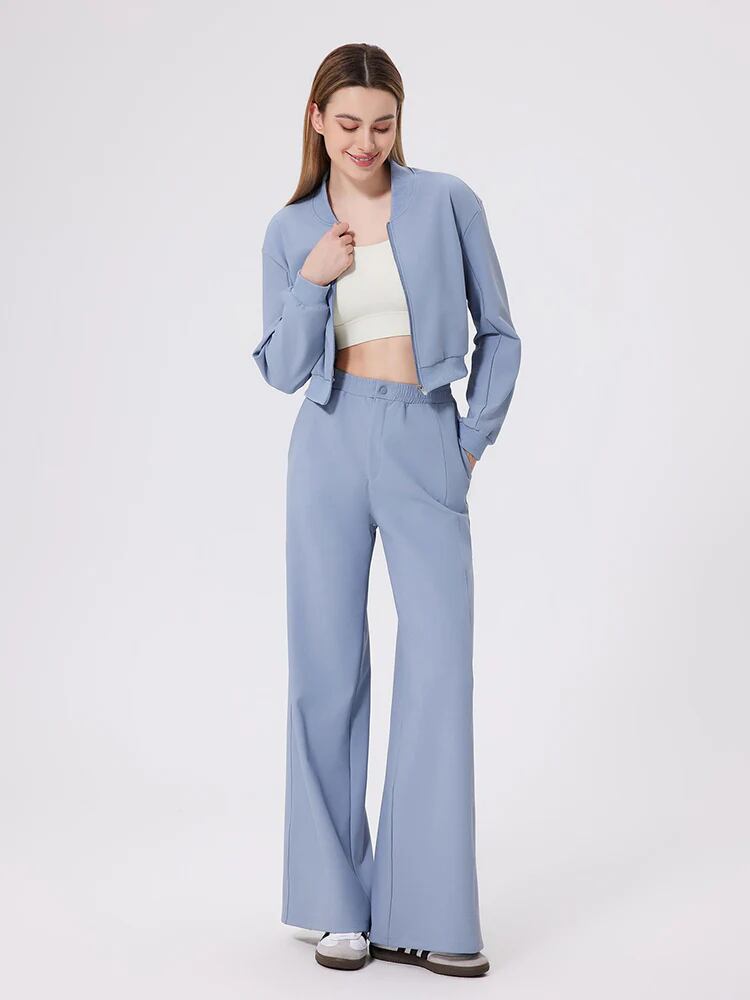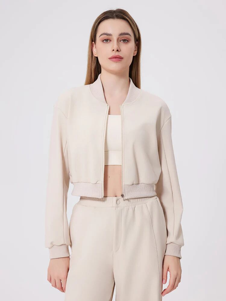 ドロップショルダー、ブレード襟、リブ編みのデザインを組み合わせたジャケット。
