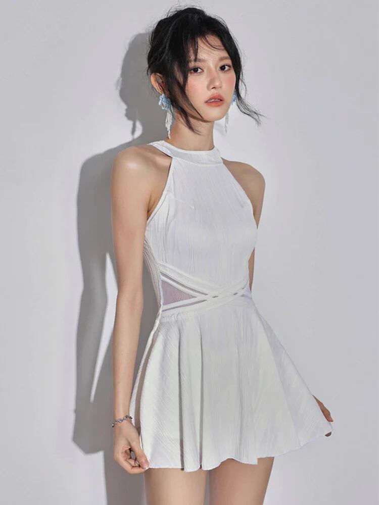 露出控えめ 背中見せ フレアスカート ワンピース水着 ノンワイヤー