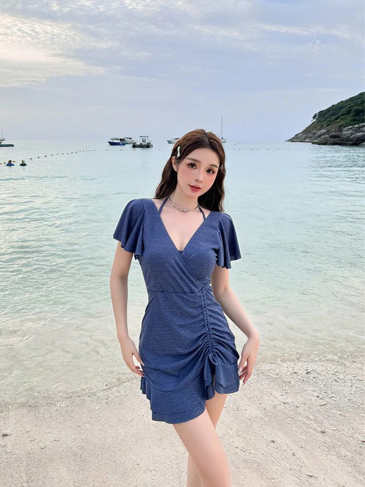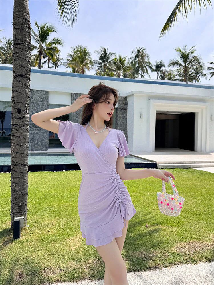 スパンコールを散りばめた生地、キラキラな大人可愛いワンピース水着。
