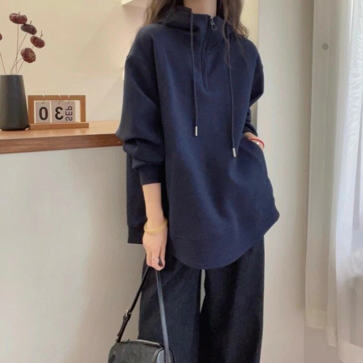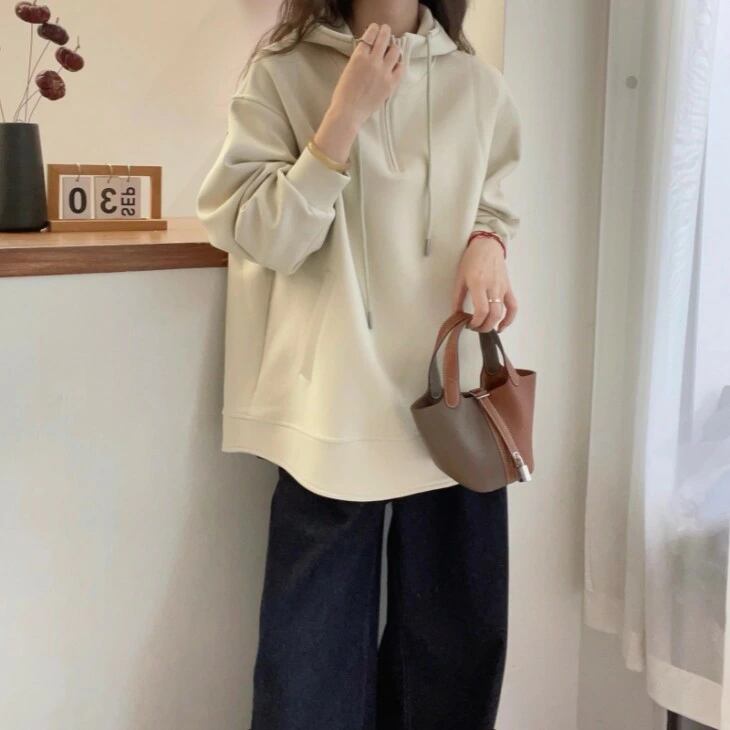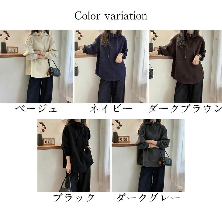 パーカー ハーフジップトレーナー スウェット 長袖 フード カジュアル 秋冬 体型カバー レディース オシャレ トレンド 韓国ファッション プルオーバー ゆったり 無地 おすすめ