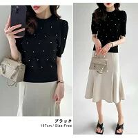 サマーニット ビジュー パフスリーブ ニット トップス キラキラ 細見え クルーネック 半袖 ドット きらきら ストーン プルオーバー オフィス オフィスカジュアル 大人可愛い 春夏 春 夏 韓国 ビジュー付き 五分袖 レディース