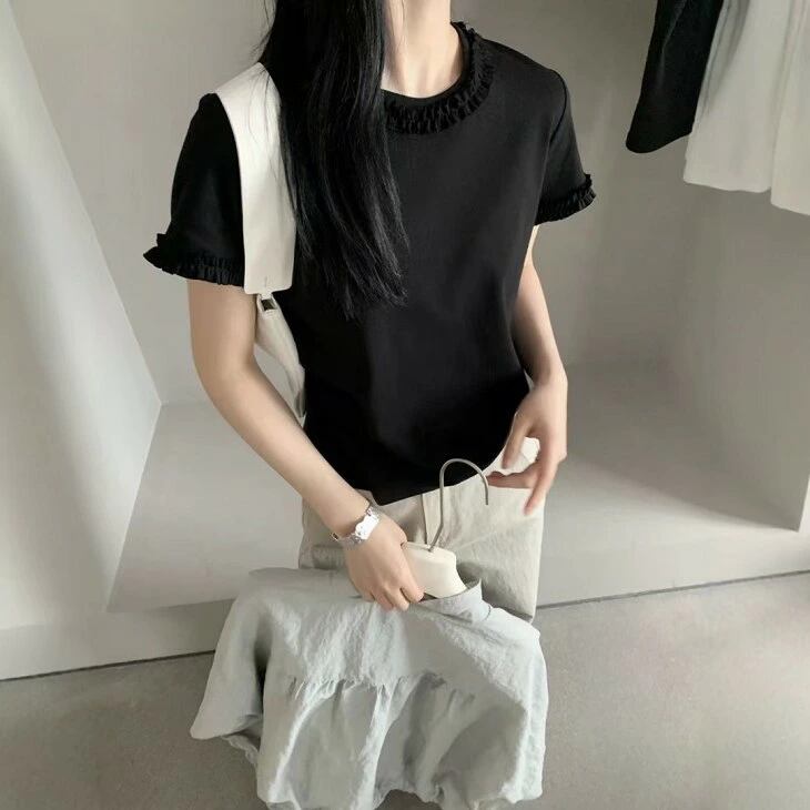 フリル ネック Tシャツ 袖フリル 半袖 無地 トップス オフィス 夏 おすすめ レディース オシャレ トレンド 人気 プチプラ 韓国ファッション シンプル カジュアル きれいめ