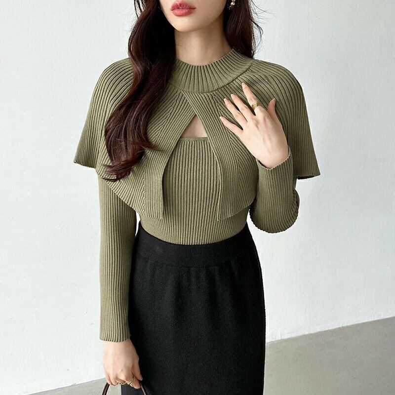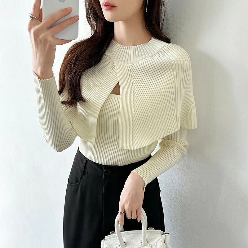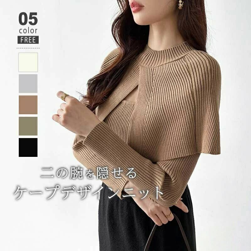 ケープニット ドッキング ニット リブニット ケープ きれいめ トップス ポンチョ ドッキングニット リブ プルオーバー オフィス セーター スリット オフィスカジュアル 大人可愛い 秋冬 春 秋 冬 長袖 レディース ケープカラー