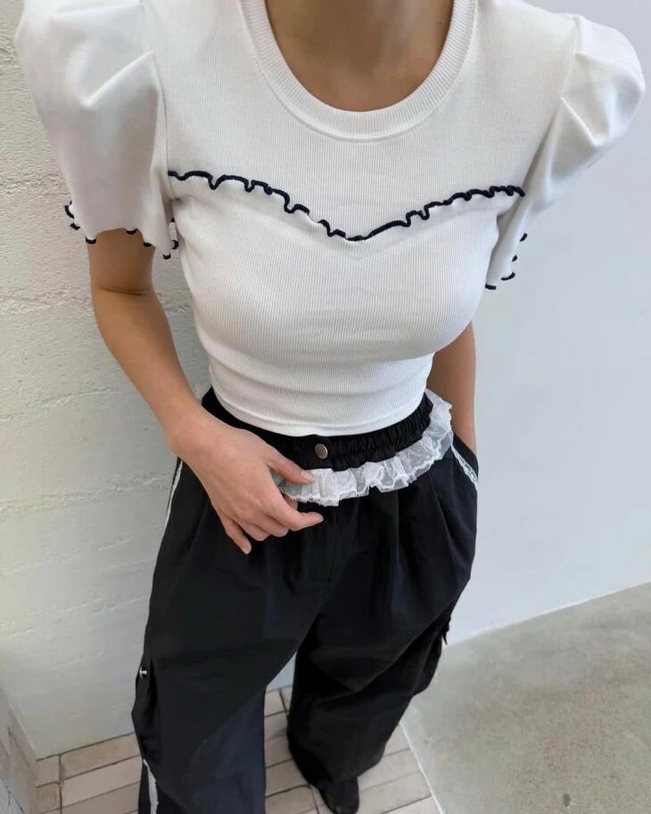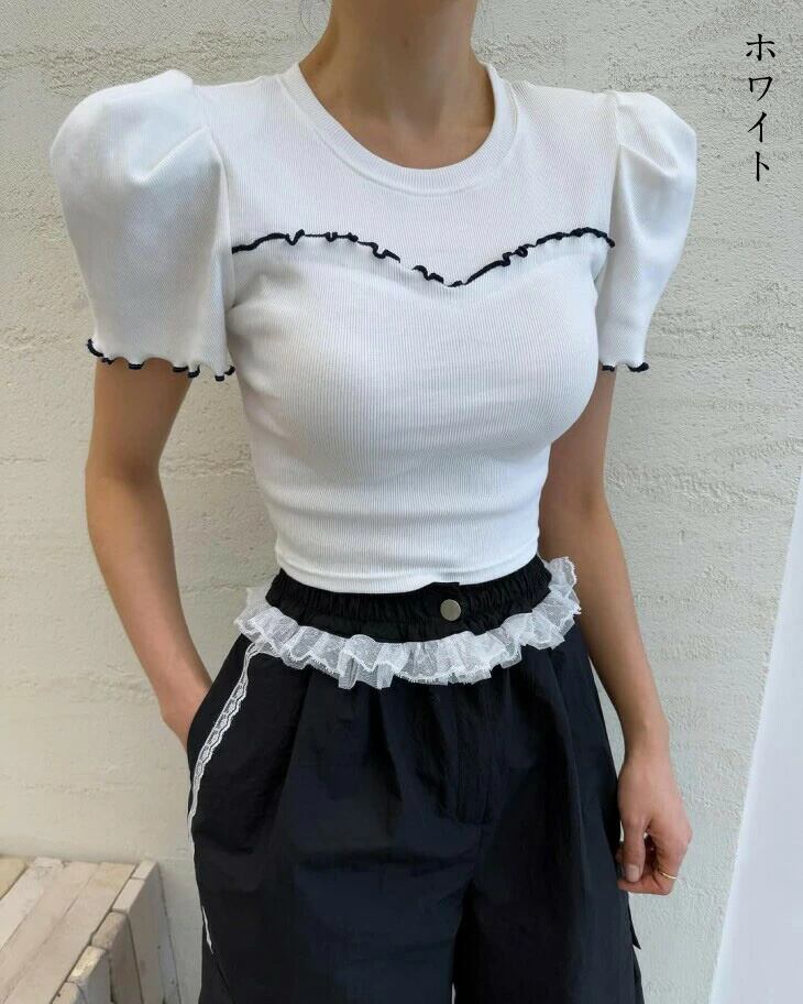 パフスリーブ ビスチェ風 トップス 半袖 クロップド丈 おすすめ レディース オシャレ トレンド 人気 プチプラ 韓国ファッション フリル 半袖 夏 バイカラー きれいめ