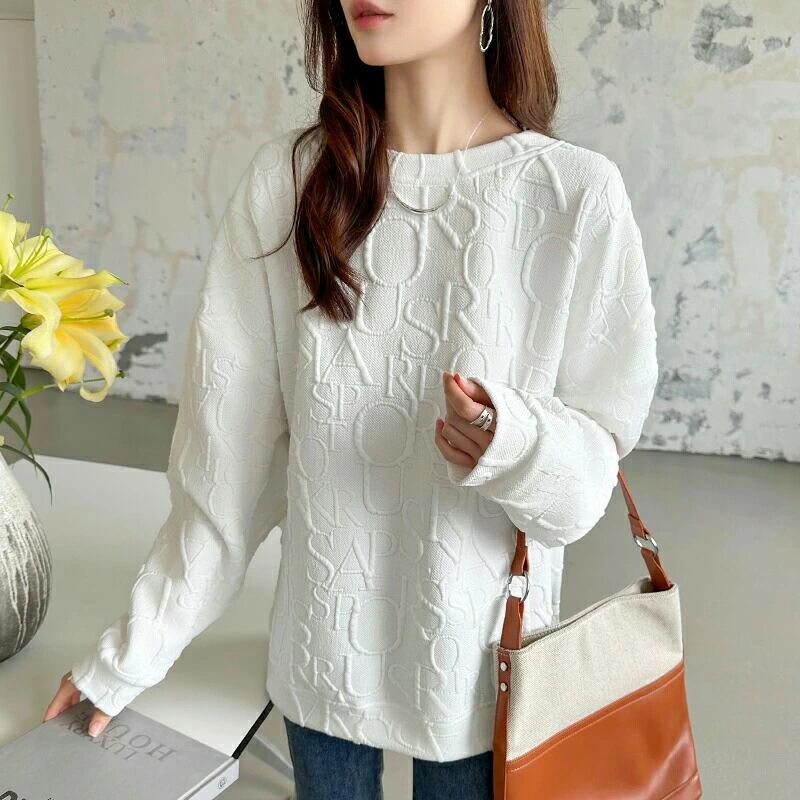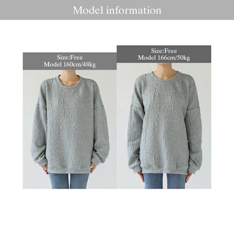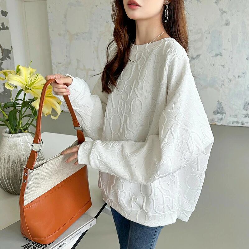 トレーナー レディース 長袖 トップス スウェット ロゴ 柄 ロング丈 クルーネック ボリューム袖 ゆったり 大きいサイズ オーバーサイズ カジュアル おしゃれ 暖かい 秋冬 春 秋 冬 韓国 エンボス加工 長袖トレーナー プルオーバー