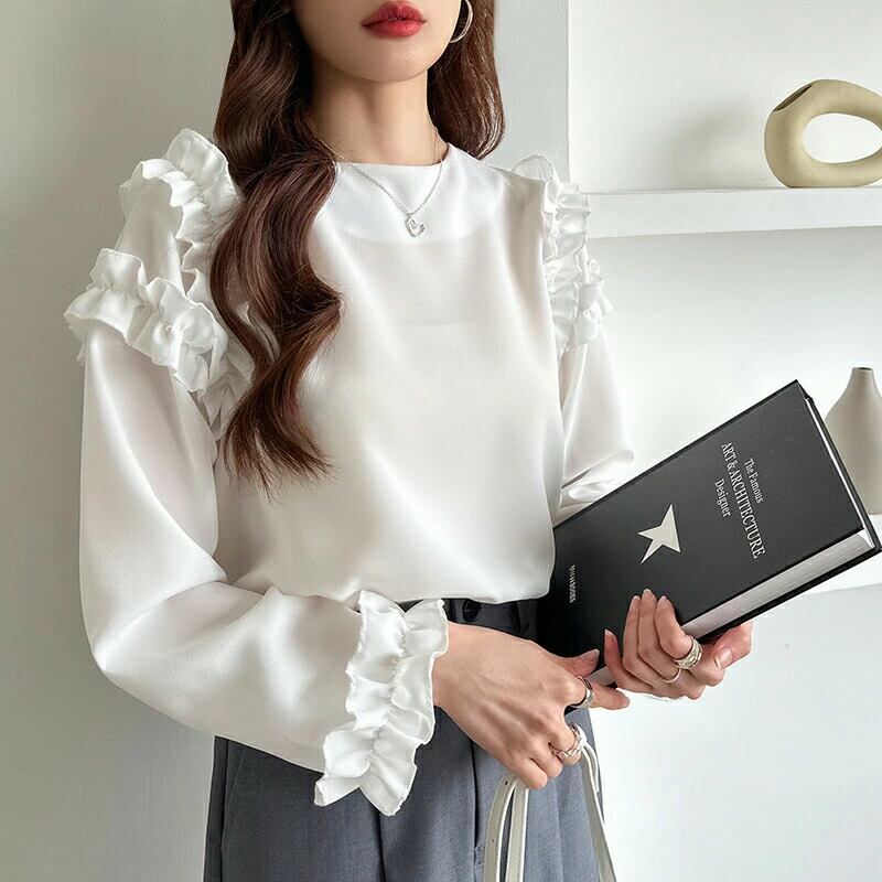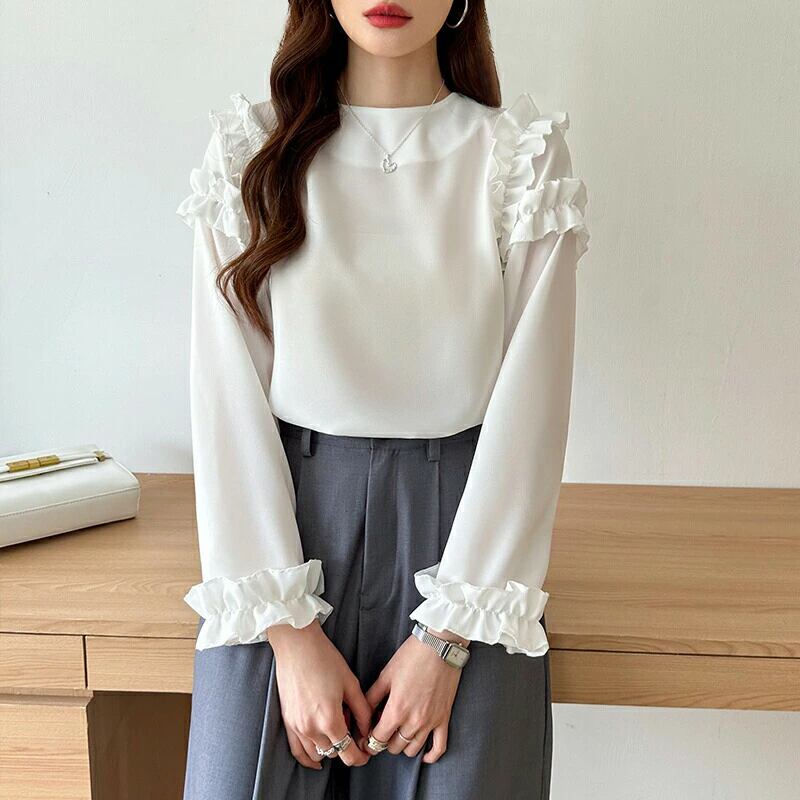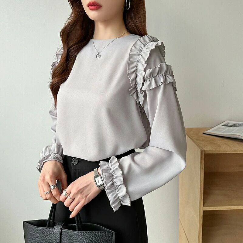ブラウス フリル ショルダーフリル 華やか フリルブラウス 長袖 シャツ 肩フリル 袖フリル シャツブラウス きれいめ オフィス オフィスカジュアル おしゃれ 入学式 卒業式 セレモニー 春 夏 秋 冬 レディース トップス フォーマル