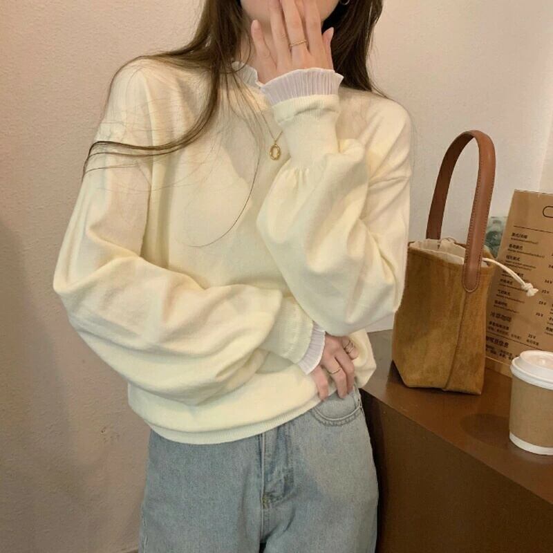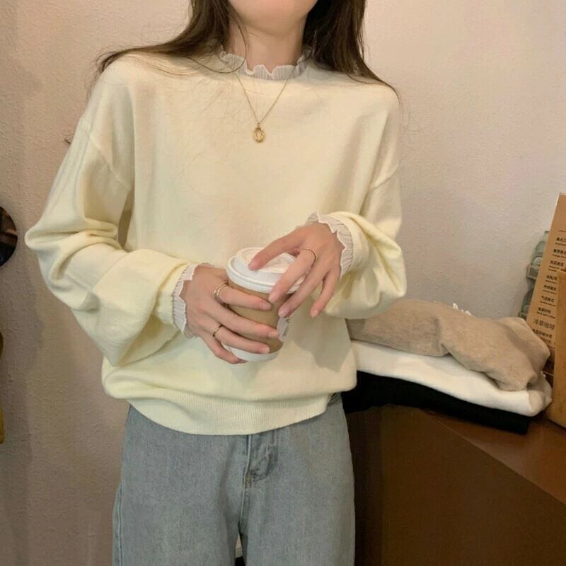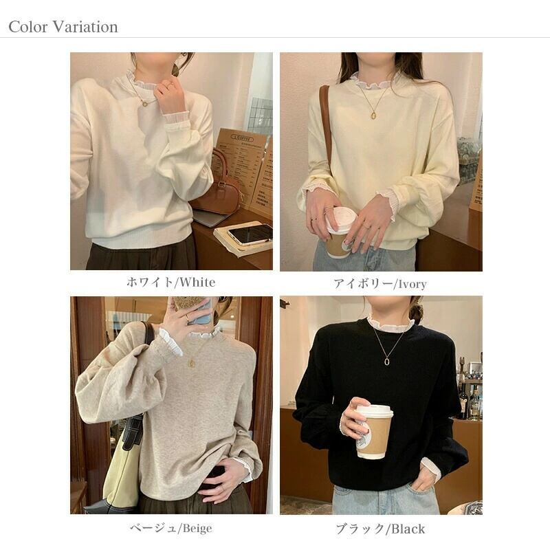 フリル レース ニット フリル袖 重ね着風 フリルネック 袖レース 襟 長袖 トップス セーター ゆったり ニットセーター ハイネック ドッキング ボリューム袖 チクチクしない あったか 秋冬 秋 冬 シフォン プリーツ レディース