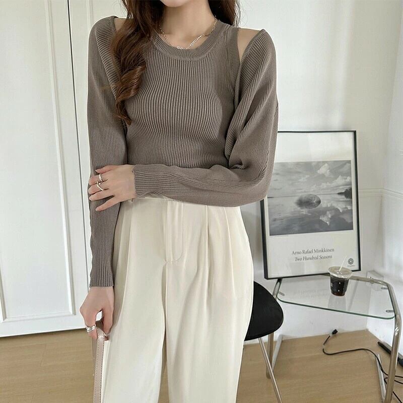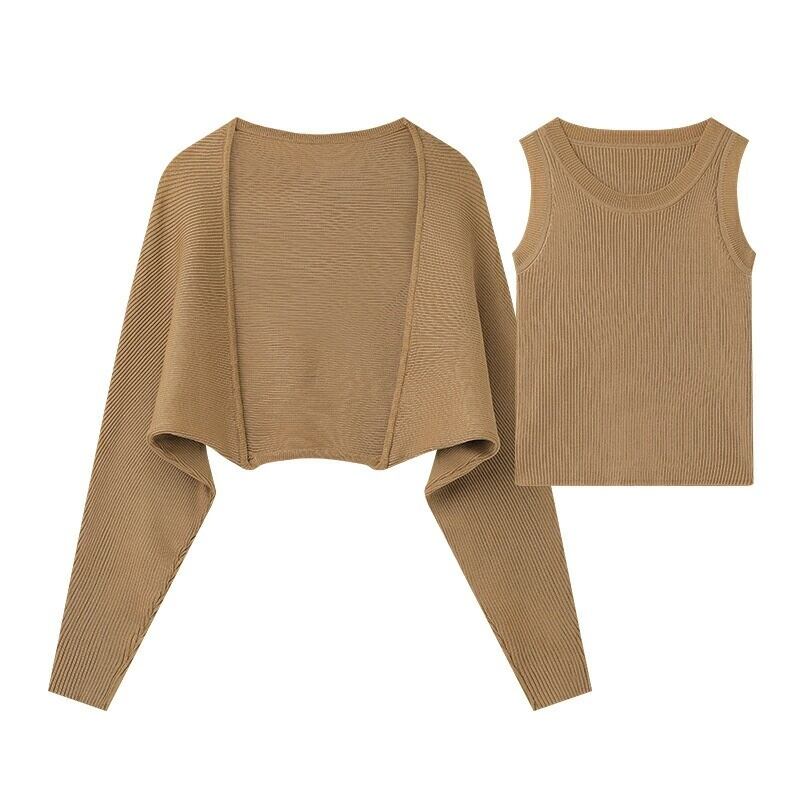 アンサンブル ニット レディース セット タンクトップ カーディガン ボレロ ノースリーブ 長袖 ボリューム袖 ショート丈 羽織り ゆったり リブニット オフィスカジュアル きれいめ 秋 冬 韓国 2点 トップス アウター インナー