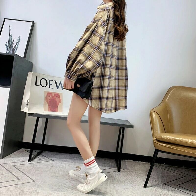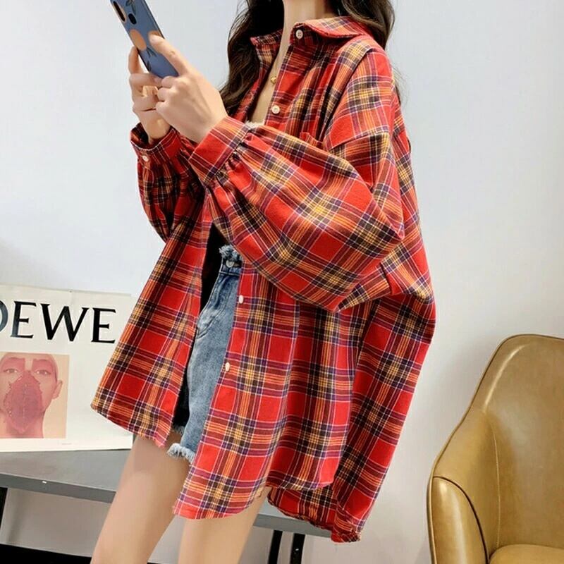 チェックシャツ チェック柄 シャツ レディース 長袖 襟付き チェック ロング丈 ゆったり 大きめ 大きいサイズ 体型カバー ボリューム袖 カジュアル 春 秋 冬 韓国 韓国ファッション オーバーサイズ 羽織 トップス ネルシャツ